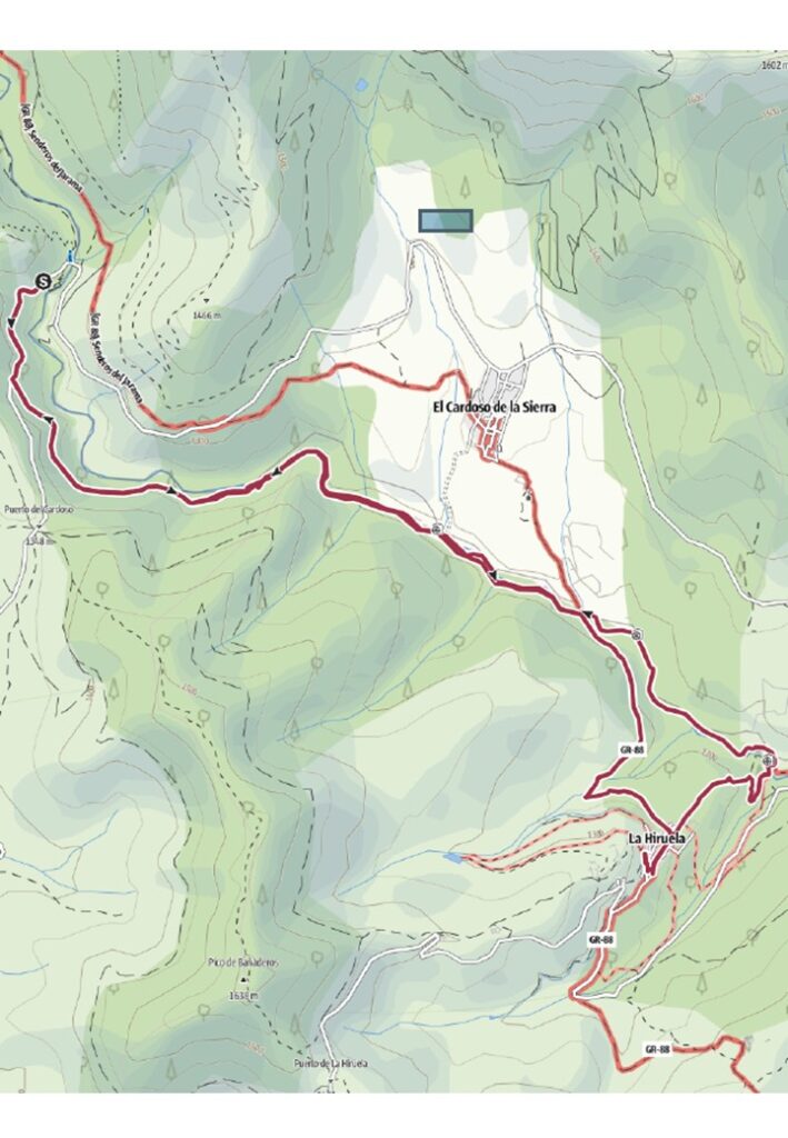 Recorrido: Se trata de una Caminata de ida y vuelta por la frondosa y fresca ribera del río Jarama (existe una variante circular que transcurre por la población de El Cardoso con distancia, desnivel y dificultad prácticamente similar). Se recorre un tramo del GR-88, la cañada de La Caleriza.