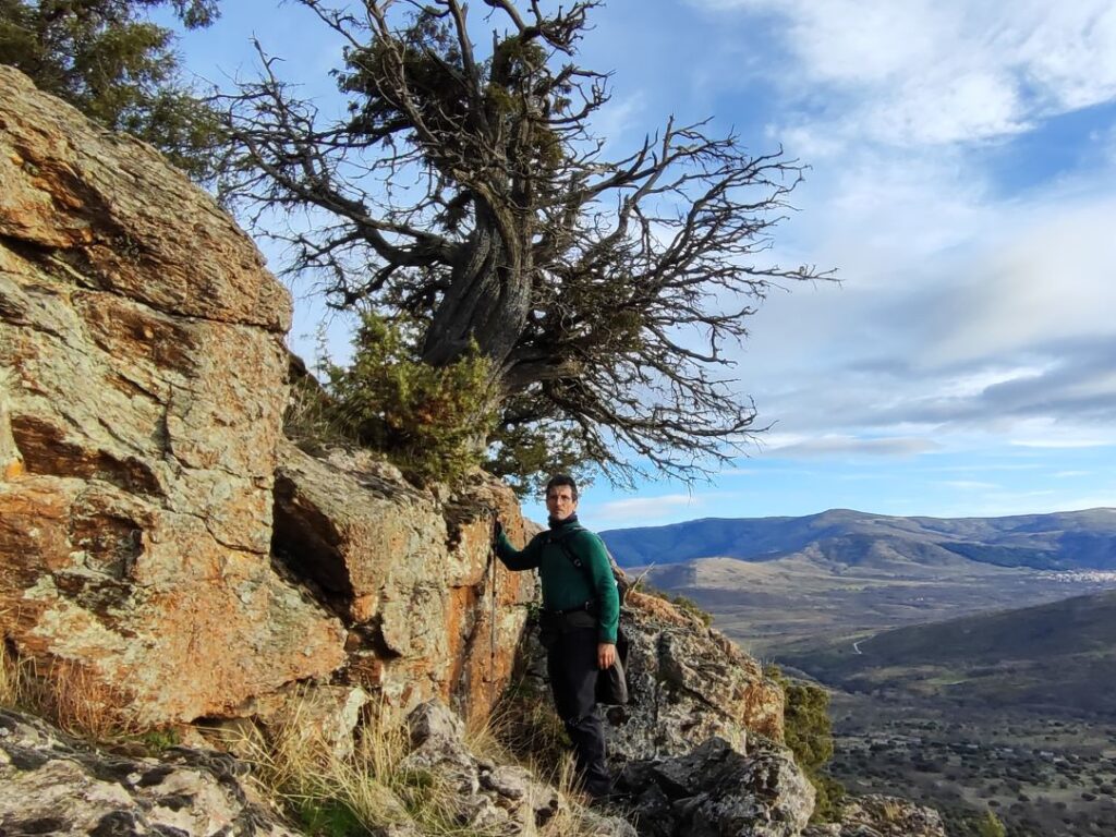 Alcanzando el punto más alto deberemos cruzar otra valla y buscar un sendero casi inexistente en descenso que nos lleva, en pequeños «sube y baja», hasta las sabinas que poco a poco irán apareciendo entre enebros y encinas. Al llegar a una valla de piedra podemos desviarnos a la izquierda para alcanzar una plataforma de roca desde la que, si sabemos distinguirlos, visualizaremos tanto el enebro como la sabina singular.